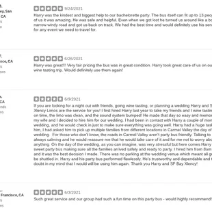 Harry was awesome! Great communication start to finish. The Cadillac Escalade limo was perfect for our party. Exactly what we needed and will definitely be calling Sf Bay Xlency Limousines in the future for more events!