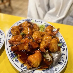 DEFINITELY a hidden gem in Oakland, the service is FAST and the food is made fresh and comes out piping hot! They speak very good English here. We ordered the hot and spicy chow mein with the hand made noodles for +$1, the shan dong chicken and the prawns with candy walnut. The noodles are really dense here. You can watch them make the noodles right at the front of the restaurant, and they use a lot of flour, so that's most likely why it's not as chewy as I thought they would be. They're good, but not amazing. They were actually better after I took them home as leftovers, left them in the fridge and then reheated them in the microwave because they had gotten "soggy" but not actually soggy. Overall, for something that every single review seems to talk about, I didn't think they were all that special. Because they were so dense they also didn't absorb the sauce or any flavor too well, until as mentioned before, as leftovers the next day. I'd pass on the hand made noodles if/when I revisit. The Shan Dong chicken was also nothing too special. It wasn't crispy, and was drowned in a sweet sticky glaze sauce. Good! But I wish it would have somehow stayed a bit crispy before it got to our table. It was still really good, but I would pass on this as well for next time to try something else! San Tung still takes the cake for fried chicken!The Prawns with Candy Walnut was excellent. Not too sweet, not overcooked and had a nice snap to it when you bit into a shrimp. Very delicious, and I'd highly recommend getting this!Overall, for the price, quality and portions, I'd have to give this spot a 5!