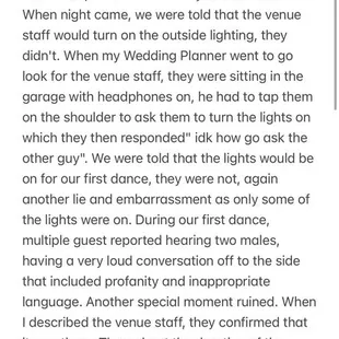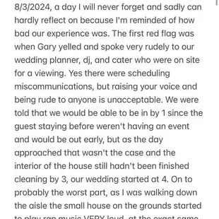RUN. I don't even know where to start, besides here: I don't ever leave reviews unless something is out of this world wonderful or completely awful, unfortunately our experience here was the latter. My husband and I got married on 8/3/2024, a day I will never forget and sadly can hardly reflect on because I'm reminded of how bad our experience was. The first red flag was when Gary yelled and spoke very rudely to our wedding planner, dj, and cater who were on site for a viewing. Yes there were scheduling miscommunications, but raising your voice and being rude to anyone is unacceptable. We were told that we would be able to be in by 1 since the guest staying before weren't having an event and would be out early, but as the day approached that wasn't the case and the interior of the house still hadn't been finished cleaning by 3, our wedding started at 4. On to probably the worst part, as I was walking down the aisle the small house on the grounds started to play rap music VERY loud, at the exact same time I started walking down the aisle. They then did it again as we started our vows and again, right when our Indian ceremony began. Luckily I was caught up in the moment, but as you can imagine was horrified, when over 50 of our guests came up to me the next day to tell me that they heard loud inappropriate music as I was coming down the aisle, and as we were exchanging vows. I was not only horrified, I was embarrassed, and heartbroken that those special moments were ruined because of a senseless person intentionally ruined them. When night came, we were told that the venue staff would turn on the outside lighting, they didn't. When my Wedding Planner went to go look for the venue staff, they were sitting in the garage with headphones on, he had to tap them on the shoulder to ask them to turn the lights on which they then responded" idk how go ask the other guy". We were told that the lights would be on for our first dance, they were not, again another lie and embarrassment as only some of the lights were on. During our first dance, multiple guest reported hearing two males, having a very loud conversation off to the side that included profanity and inappropriate language. Another special moment ruined. When I described the venue staff, they confirmed that it was them. Throughout the duration of the wedding, we were told that the venue staff would be responsible for cleaning up the grounds, including the bathrooms and filling the toilet paper and empty the garbage. This was not the case, our Wedding Planner again had to go find the venue staff in the garage, tap them on the shoulder and ask them to change the toilet paper multiple times. The response was "here's the toilet paper you can change it" and he threw it in the table. The garbages in the bathrooms were overflowing, the Wedding Planner had to ask one of my wedding guest to empty the bathroom garbage. Multiple times throughout the night the Wedding Planner had to ask the venue staff to please not be out around guest sitting on the floor as he was and on his phone. We used the venues, Dancefloor, which they set up, it was installed improperly. There was nothing underneath, leveling the dance floor so throughout the night pieces started falling apart, causing my four-year-old daughter to trip as well as many other guest. The Wedding Planner had to fix the floor multiple times to ensure our guest did not get hurt. The next morning I woke up with bug bites throughout my arms and other guest that stayed at the home, also reported the same bites. When we were getting ready at the venue, and the cleaning staff were still there because they were not done cleaning in time the Wedding Planner observed poor cleaning habits of their cleaning staff and also in conversation with Gary heard him disclose that he takes the bedding home to wash at his home, according to the Wedding Planner this is against hotel and wedding venue regulations. After hearing everyone's concerns and being enraged by the fact that we cannot look back on our wedding day without remembering the disaster that it was we decided to email Gary and ask for a refund since we did not feel he withheld his part of the contract and because our experience was so poor. We were hoping that Gary would understand our concerns and would give us some sort of peace, but instead he invited us back to the home to discuss our concerns and gave us every excuse under the sun for every single concern we had. (Full review in photos)