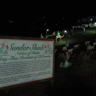 I see Toni M. has given you the links to history, but I thought I would include a brief bit here.A very nice Sikh man, Mr. Shadi, moved to El Cerrito back in the day. He was so impressed with the warm welcome he received that at Christmas time he put a star up in his yard as a thank you to everyone who had welcomed him. Over the years the star somehow grew into an amazing nativity scene that covered 2/3rds of a tripple lot where he lived. Years ago (when they were in high school) my uncles helped him put the things out. When he passed on, his children sold the property and gave the nativity scene to the city of El Cerrito, who now put it up on the empty hillside along Moeser.It is a little harder to see there than it had been on his property on the Arlington, but is still well worth it. It has every possible compenent of the traditional Nativity, plus a plethora of other things that Shadi collected over the years. It is charming and inspiring. My family used to make an annual pilgrimmage here every year. We should get back into that tradition.