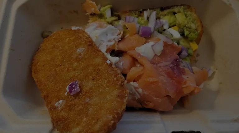 The Brass Haas is a ghost kitchen* that serves up open-faced sandwiches, sides and drinks. In particular, they serve a variety of Avocado Toast sandwiches. I've seen The Brass Haas listed on local food delivery apps for awhile now. I wasn't really sure what they serve because there's no description and the photos are terrible. But this morning, I saw Doordash offering a "50%-off " promo to try this place. Ok, I'm taking that deal! So I order the " Smoked Salmon Avocado Toast" and a hashbrown. The Smoked Salmon Avocado Toast has avocado, smoked salmon, onions, capers, and creme fraiche. The sandwich is actually pretty tasty. Also, presentation and appearance was nice too. Although the smoked salmon did slide around a little in transit. The open-faced sandwich dates back to the Middle Ages. It's simply a piece of bread, used as a platter to hold all kinds of good ingredients. But they must be placed with care and skill. How is looks and tastes are both important! The proper way to eat an open-faced sandwich is with a fork and knife. But we are in America, so freedom of choice says I'm using my hands! And of course, the onions and bits of salmon fell off the toast. So overall, a 4-star experience. Doordash delivery was prompt, direct, and friendly.-----------------------------------------------------------* The Brass Haas is ghost kitchen at the Oakland Food Hall. A ghost kitchen has no dining room or table service. Everything is pickup or delivery. All sales are done thru delivery apps or a website.