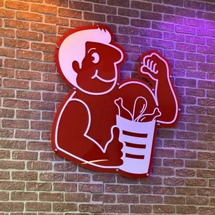 Holding piece of chicken in front of logo