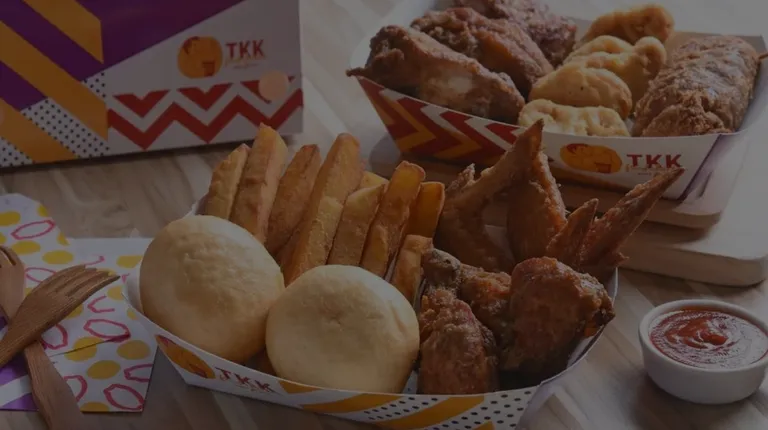 Interior shot of store with TKK logo on brick wall; tv monitors with menu items and promotional posters.