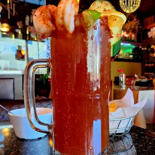 a bloody drink with shrimp and garnish