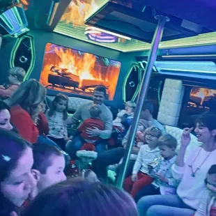 View from inside the party bus. Flat screens and neon lights everywhere.