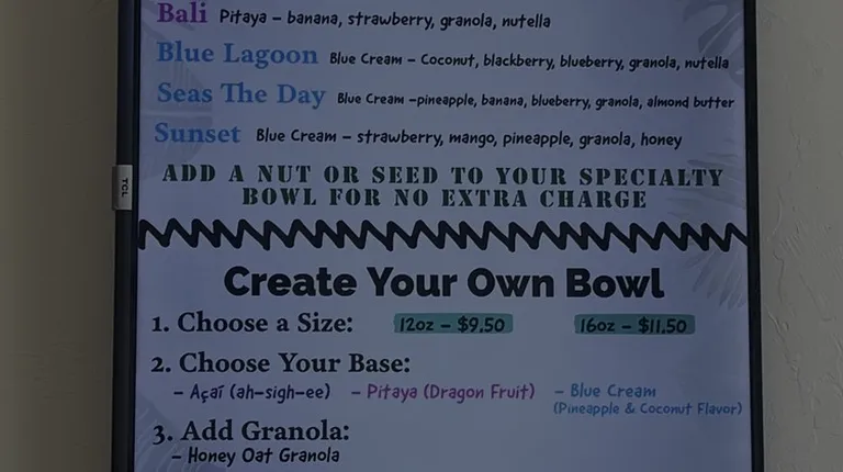 i ordered the Create Bowl with blue cream and the Pink Drink energy tea, highly recommended!! the fruit is very fresh and sweet!
