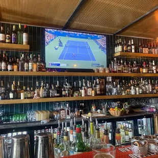 a bar with a television in the background