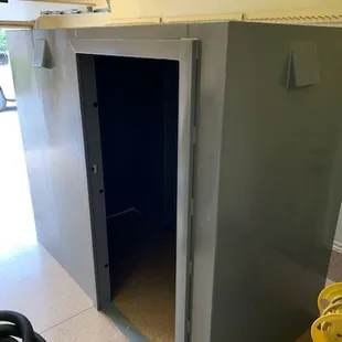 Outside door is thick and well constructed with ventilation on bottom and window above.