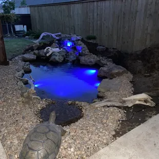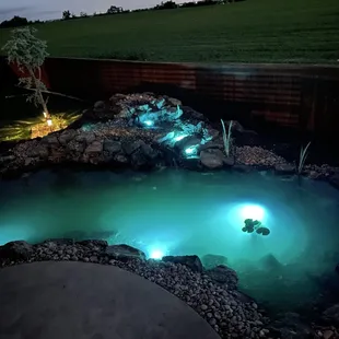 Night view of my garden pond with lights.