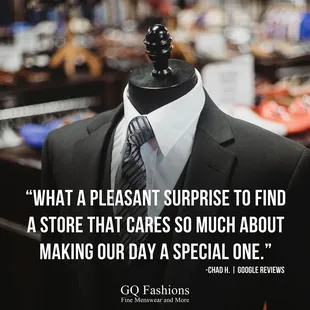 Love this place so much. The people there are straight up amazing at their job! One person helped me out a lot but the suits were out of my budget so we were about to leave, but then, from across the store, a guardian angel told me he has a suit for me. While skeptical at first, I agreed. He goes across the whole store and finds the perfect suit! It was actually the perfect price as well and looks great on me! Loved this place and will definitely go again and recommend it to anyone who'll lend an ear!