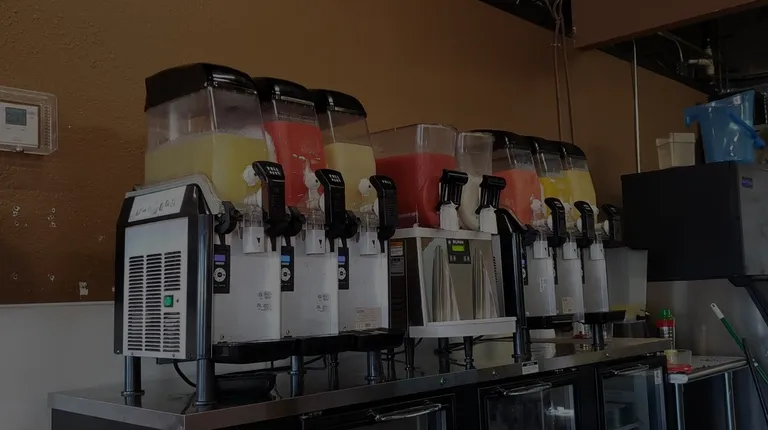 (Left to right) Carne on flour, al pastor on corn tortillas. Side of rice. Mango margarita.