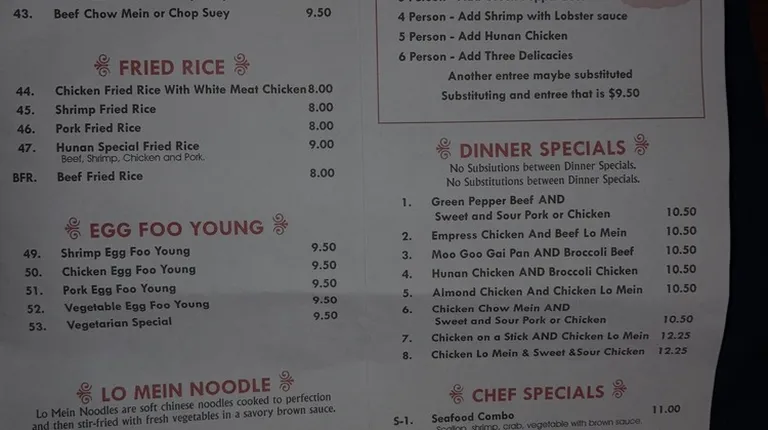 We like all the food we've eaten at Hunan's our favorites are Hunan chicken or Empress chicken. Their eggs rolls are awesome. Summer and the others that work there are nice and always give good service. We highly recommend !