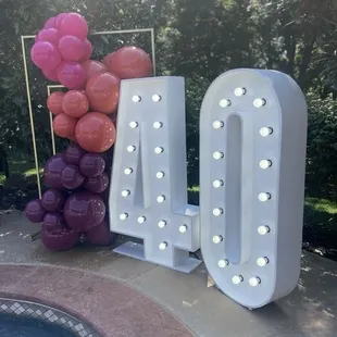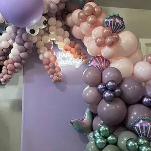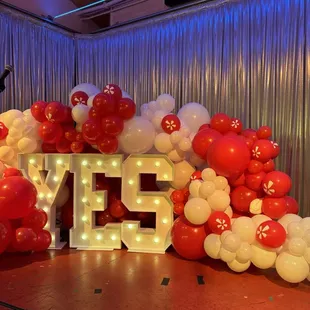 Stage Design 12ft drapes, balloon decor and custom sign.