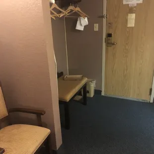 Don't discount this hotel. The front desk was wonderful. The room looks old but nice for the price. Bed was comfy. Plenty of pillows. Wall mounted tv. Nice clean bathroom. No bugs. First thing I always do is check beds in every hotel. A/c works fantastic. Our bottom floor has a nice little sitting area through a sliding door with two chair overlooking the poolVery quietBreakfast has all kinds of starches: waffles, biscuits, oatmeal. No eggs or bacon. Grandy's is less than a mile away. Va hospital is a five minute drive. Will stay here more often.