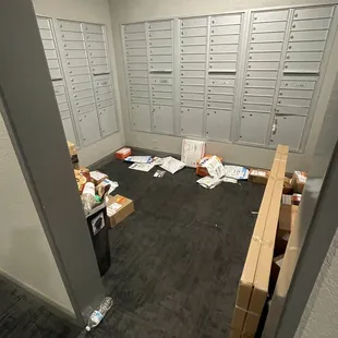 Unsecured mail room (no door or access code required) where they throw packages on the floor.