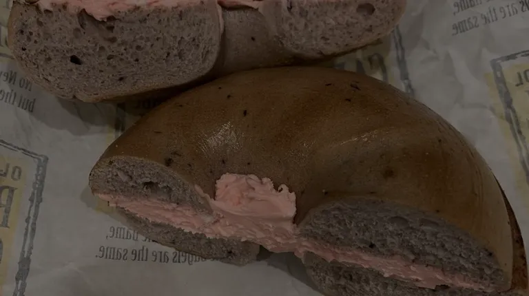 Bacon and Chive cream cheese on a Asiago bagel.