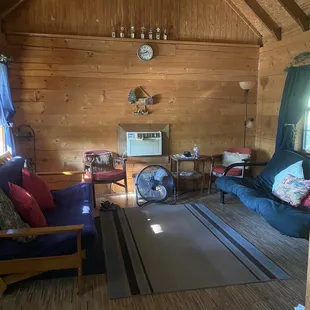 This is one of the medium-size cabins and this is the living room area with our dog in my husband