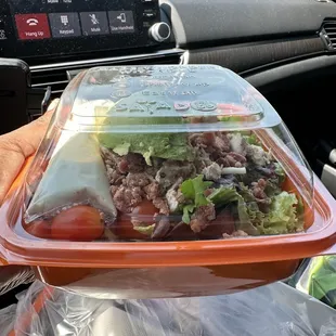 Avocado, marinated chickpeas, Brussels sprouts, cucumber, croutons, spinach, romaine and chicken or tofu, or steak (add'l charge). Paired with lemon basil vinaigrette (add 280 cal).