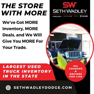 We are a hotshot company and we were on a run from Louisiana to North Dakota and our Ram 3500 lost power and started making a horrible noise. We found Seth Wadley right off the interstate and went in on a Saturday afternoon to find that they didn't have a major mechanic working saturdays, but this did. It stop the gentleman in service from helping us. He did all he could to help us by running the codes. We started to leave and decided to see if we could figure out if it was a hose or something since the codes did t show anything. My husband found the exhaust gasket was blown. This was good news since we just knew it was the turbo. The young man in the parts dept was just as helpful as the service guy. He even printed off part numbers hoping we would be able to locate the parts that he didn't have in stock for the turbo. After finding out that it was not the turbo they had the gasket and the crank breather. While my husband was working on the truck in their lot we had 3 Salesmen approach us. One offered cold drinks and to come inside. Another brought us cold drinks after we were out there for about an hour and asked if we needed anything. Another came out offered us drinks and wanted to know if he could get us some food. Now if they are this great to someone who isn't even buying a car, I would love to see how well you are treated if we were buying. When we were leaving another salesman came out to check on us and said he was so glad to see us getting our truck going. Thank you for such hospitality. When we buy a new ram we will for sure be going to Seth Wadley for our new truck. I am so thankful we were close to this dealership when we had trouble. God did answer our prayers, because we were back on the road and will make our drop off time. Thank you!!