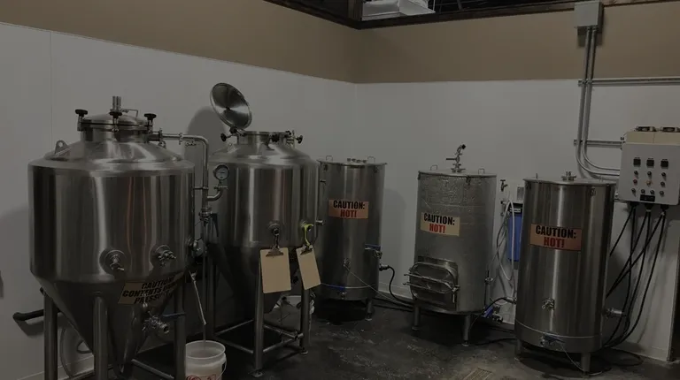 a row of stainless steel tanks