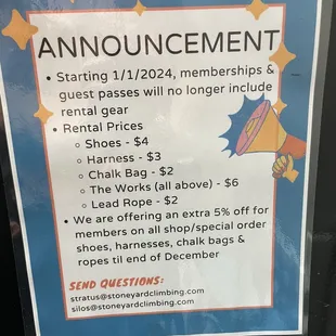 This is a great climbing gym,There is lots of kids on Tuesdays and Wednesdays Thursday still have some but not as many. They don't change to bolder very often,They make you pay for the membership and shoes, harness, etc.