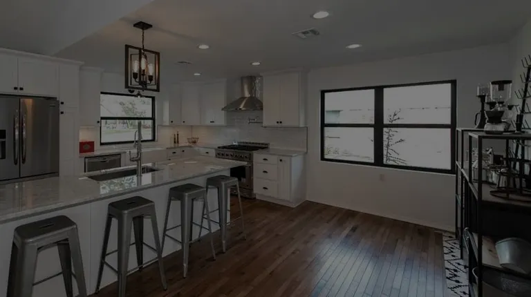 Black windows in a modern farmhouse style kitchen.