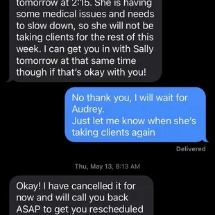 I had gone to Waxed a few times and always scheduled my next appt before I left. I received a text message the day BEFORE my scheduled appt (also the day before I was scheduled to leave for vacation) that it needed to be cancelled because Audrey needed to take a few days off. They did try to schedule me with someone else but I declined because I don't like to have everyone messing with my brows. I was told that Audrey would be back that next week & they would call to reschedule. No one EVER called so I finally decide to call them. And low and behold, she's back & taking clients and no one bothered to contact me and reschedule. I now have to wait nearly 3 weeks to get back in. I definitely should have been a priority considering I was already on the books and THEY cancelled it.Not cool and for this reason, they have lost my business.