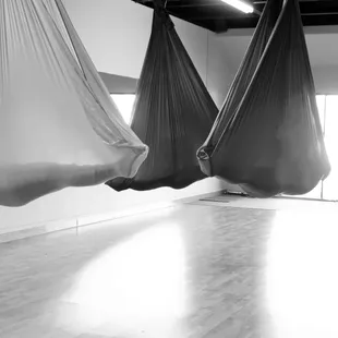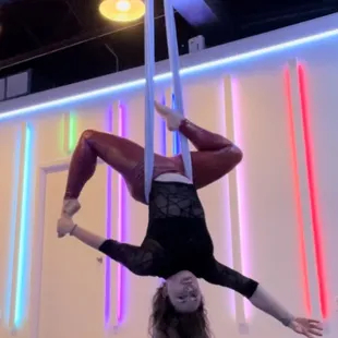 Me working on a cool aerial hammock trick at aerial bombshell!