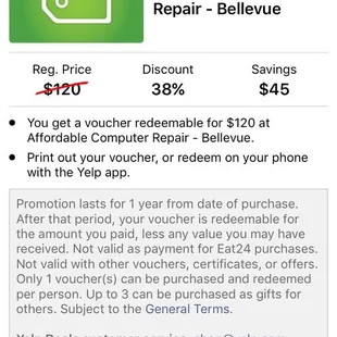 -DO NOT BUY YELP DEAL from them unless you only need a "cleaning". Voucher states $75 for $120 worth at Affordable Computer Repair Bellevue. My voucher was not honored bc the guy claimed that was only for a "cleaning". Ummm ok, considering it doesn't state that anywhere (not even fine print) on the deal. -In general assessment: Overpriced services, even waayyyyy over quoted on parts. (From Apple directly part was less than HALF of what they quoted me)-They don't credit over priced diagnosis towards work.