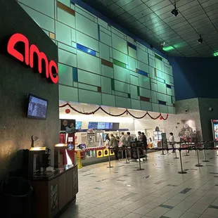 This theater is the closest to our house, so for the dumb little movies that come out (not the big ones we want to see in Dolby, Alamo features, etc), we hit up this theater. The lobby and theater are usually pretty clean, and it isn't super busy most times we've come. They don't have the comfy recliner seats that a lot of other theaters now have, so that's one drawback. They also have a lot less variety when it comes to the confessions they offer. Mostly just popcorn, candy, and a handful of the hot items like hotdogs, etc. but definitely quite a bit less than the other AMC in town. I don't so much come to the theater to eat a meal, though, so that's not a big deal for me.Overall, this is a pretty basic theater that's good for smaller movies that don't need to be seen on a giant screen with a booming sound system.