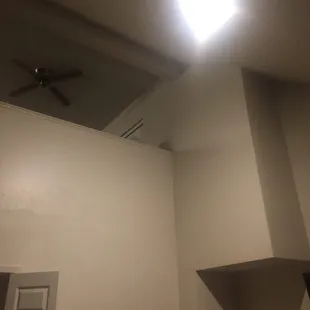 Broken lights carelessly hanging from a wire in the ceiling. Fire Hazzard.