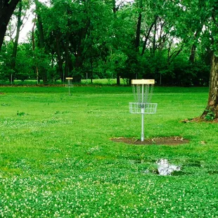 It's a decent flat 9 basket course. Great for practice,with friends etc. Not too crowded except when soccer season rolls around at 7th hole in the back field or some bbq/party happening near 2nd hole... people just stroll right in front of you to and from the soccer fields crossing paths of all baskets not paying attention..find myself waiting for people to clear out half the time. Try and play before school is out if you can help it.