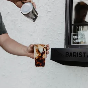 We offer regular, skim, soy, almond, coconut, and oat milk!