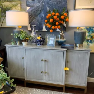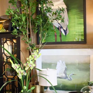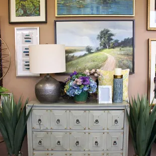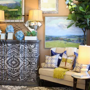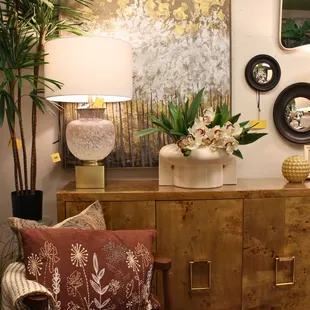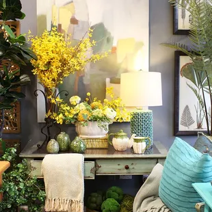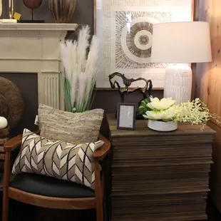Home décor, accent furniture, silk trees and plants in white and neutrals.