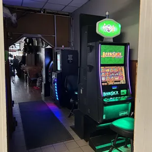 a man and a woman playing a slot machine