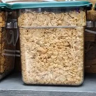 a shelf of cereal and cereal