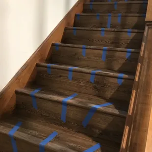 a picture of a staircase with tape on the steps