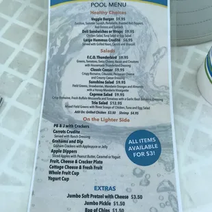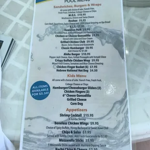 My review is for poolside food, although I recommend the dining room as well. That will be a review for another time. The menu is extensive, unusual for poolside IMO. We had the Hawaiian pork, a classic cheeseburger, ghe Aloha burger, the Thunderbird salad and kids chicken fingers. All sandwiches come with a choice of fries, fruit, slaw, cottage cheese or chips. The fries were crispy and hot. The fruit was excellent: watermelon wedge, strawberry, and a big chunk of pineapple, cantaloupe and honeydew. Chicken strips were crispy, hot and moist inside. Just right. The pork was a generous serving with a generous amount of BBQ sauce. The burgers were tasty-not fabulous but thick and adequate. Could have used more seasoning. Salad was also a good choice with generous greens, tomatoes, Swiss cheese and bacon, topped with homemade thunderbird dressing. Our server was polite and our order came very quickly. We will be here a lot this summer so I'm pleased to know the selections are excellent and the service is too.
