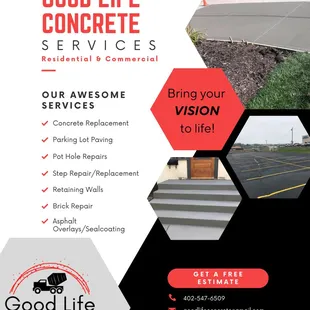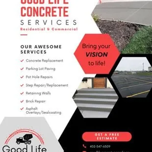 Good Life Concrete made replacing my front steps so easy! I had called over 3-4 companies and could get no one to show up. I was very frustrated! I called Good Life and they had me send over a quick picture of my steps. Within minutes I had an estimate. I was very impressed! They sent out James to answer all of my questions and he confirmed that bid they had initially provided was right on. I gave James the ok on the spot. They came out the next week to complete my project within 1.5 days. My steps look beautiful and I'm one happy customer. I will be calling them back to do my driveway extension next.