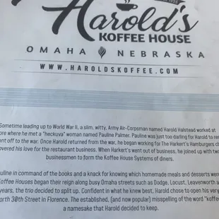 Stopped in for another fabulous "House Special" and Koffee before heading up the road to acquire my first kick-off "stamp" on the 2024 Nebraska Passport at Mormon Trail Center at Winter Quarters. Since the theme of the Passport day is history, I've added a photo of the back of the updated menu, which features the history behind Harold's Koffee House (from the large "FOOD" sign, retaining the misspelled "koffee," and Historic Florence). Service again is A+ as they're always hopping.
