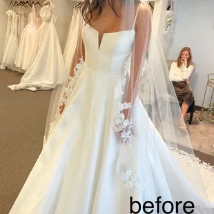 I truly cannot say enough amazing things about Diana. She took the vision I had for my dress and made it the perfect reality!! We took a poofy original and made more of a square neck with thicker straps and added a slit in the leg. Honestly if I had to do it all over again I would've just had her create a custom dream dress and skip the trying on a bunch of other dresses! That's how talented she is! Not to mention the best human ever. I miss looking forward to our appointments together & will definitely be seeing her with any and all altering needs! (She also altered my sister's bridesmaids dress that was 2 sizes too big in such a timely manner). Love love love!