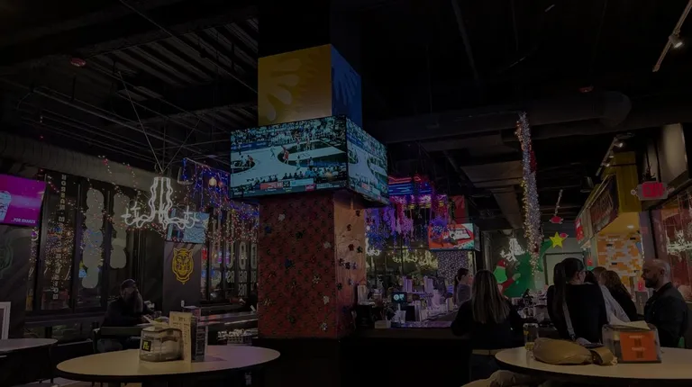 So great to find another well-executed food hall. Kamp provides a great variety of dining choices and beverages. One can get tacos, Korean corn dogs, Crab Rangoon nachos, wraps, and more.Seating was available around their very large bar, and at a variety of tables. The room is glass-walled, giving it a great ambiance.The most interesting novelty, for me, were the Ice Shots. One buys a shot served in a frozen ice shot glass, and once drained, throw said glass at a bell. Striking the bell gets you a free drink. It appeared to be more difficult than it looked. Never did hear that bell.The rough part is parking. While already tough in that side of town, it's made tougher due to construction.Will return.