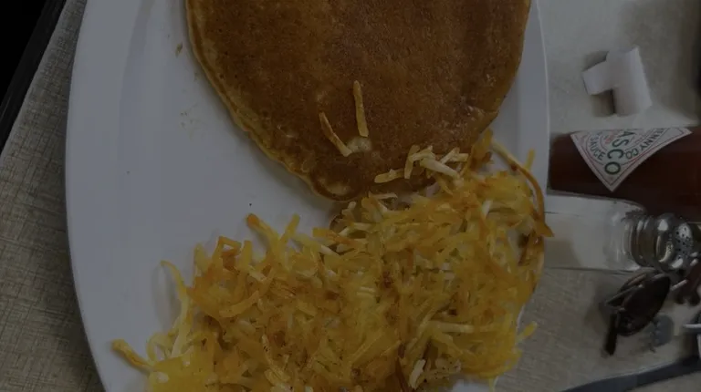 Our first time in. Breakfast plans. 2 cakes and 2 eggs. Burnt everything except eggs over medium. And all is really good. B says biscuits n gravy are not very warm/hot. I really like what I got here.