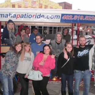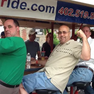 We picked the 'cheapest drink stops' ride option.Rachael hits the nail pretty squarely on the head. Our group's experience on the Patio Ride was probably pretty similar... laughing, shouting, dancing, pedaling, singing. It was a hell of a good time. And while primarily I think the Patio Ride is thought of as a bar hopping methodology, I could easily see it being something fun to do with a non-drinking group or a family reunion since they run all day (8am - midnight) around the Old Market.There are some non-pedal seats available as well, if you had children or elderly riders you wanted to accommodate (4 total non-pedal spots, 2 on the bike and a 2-seat bench on the back). They can tailor the ride to be whatever you want and give a good mini instruction to how the contraption works beforehand (how to signal, when to pedal, etc).For those of shorter stature (5'-5" and under) it was a little bit of a reach to get to the pedals, and I banged my shins several times on the metal bars. Oh well, that's the price of fun sometimes. Cost was around $22/person for a two-hour ride (we had a full bike). And the looks you get from people on the street are priceless!