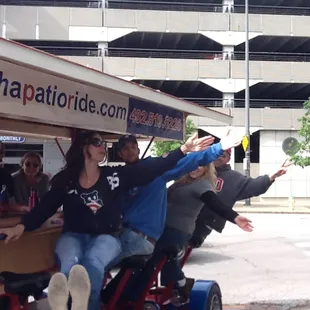 Patio Ride was freaking awesome.Having never been to Nebraska, my friend informed me that we were going on a patio ride. My first response was a, "umm... what? What the heck is that?"A patio ride is a picnic table (that you would find in parks, etc), with 12 stools around it, with each stool having biking pedals attached to it. From the manpower of the individuals sitting on the stools, the actual picnic table (which actually has 4 large wheels), gains enough momentum to go, with the driver (who was named AC), steering the individuals around the area.What's great about this patio ride is that it's a tour/bar crawl type of ride. For 2 hours, we pedaled around downtown Omaha, getting to see the sights, stopping from point to point, to grab a drink or something to eat. I think we had close to 4 to 5 stops. In addition, the patio ride even lets you bring your own drinks/food and music on it as well.It was a BLAST. We had music blaring, and it was SO MUCH FUN. Imagine singing at the top of your lungs "We are Young" by FUN, while pedaling around randomly on this table, hopping from place to place in downtown Omaha. Plus, AC was a lot of fun, chatting with us, laughing with us, just being a great driver and guide.Only some of the restaurants offered patio ride specials (If you're on the patio ride, you would get discounted food and drinks at Julio's, etc), but I could see it picking up in the future, as it's only been in Omaha for a few weeks. Definitely a must do in Omaha. Definitely. I had a blast!