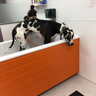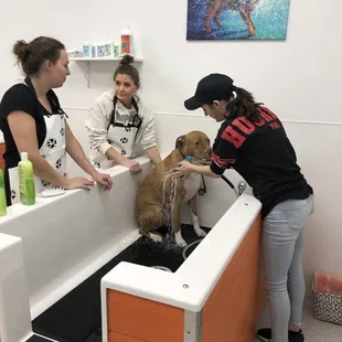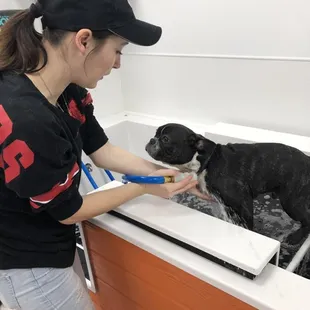 This place is phenomenal!!! We took our 2 Golden Retrievers there after getting muddy at the dog park & the employee working was more than helpful. We gave them a bath & it was so easy! there are aprons to wear so you don't get wet, short "leashes" to keep your doggo in the tub, a non-slip mat, towels, wash cloths, and a rubber brush. We used the hoses that allowed for water to mix with the soap so it's easier!!! there are also dryers to use so your pup won't have to go outside wet.overall very happy with my experience and will for sure be coming back!