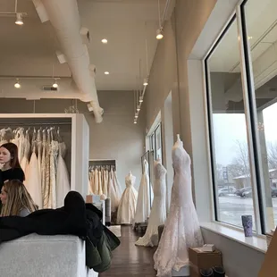 Making an appointment is very easy and they're willing to work with your schedule which is wonderful. My sister bought a wedding dress from this store and she found success so I decided to try it out as well. I think depending on the time of the year you go, they have you take your shoes off, but I'm not sure. I went looking in September and the people who came with me weren't instructed to. Monica was attentive and so patient with me, super consultant! I chose not only a wedding gown from this store, but bridesmaid gowns as well. Now for the not so great stuff- one bridesmaid of mine mentioned that at her fitting, the owner, Jocelyn, made kind of a rude comment about her rib cage being large? And that she was surprised my bridesmaid fit into a certain size dress... not professional at all. I told my sister about this and she said the owner probably didn't mean for it to sound mean. Then when I came in to pick up my wedding dress and try it on again, Jocelyn made a comment about my back being wide and that some designers just don't think about how wide Midwesterner are. I'm pretty insecure about my shoulders and back and it was a thought that crossed my mind the first time I had arrived at the store and tried it on. I even asked my friends and family that I brought with me to my appointment. I guess things slip out, but when you're a business owner and a professional- you can't just say whatever comes to mind. Especially when your business is all about dressing people for a huge life changing event. All in all, lots to select from and Monica is amazing! But don't be surprised if the owner says something about your body... to your face.