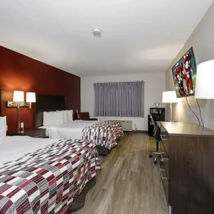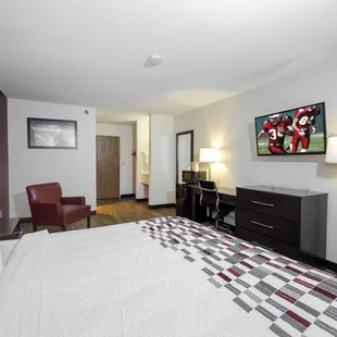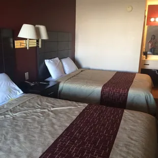 This is the first time I've ever stayed in a Red roof inn, and probably my last! The duvet was stained and had cigarette burn holes in it, the carpets where dirty and had crumbs from I'm guessing past guests! My cousin went down to get batteries for her remote and the front desk lady said "your room is much to cold you need to turn the thermostat up" my cousin asked when she had been in the room and the lady said "well while you where gone I was going to change the batteries in the remote, but I didn't go through your things." The batteries hadn't been changed unfortunately, be cautious when picking this hotel.