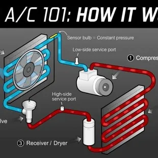 Our A/C Service includes evacuation of the system, vacuum test for leaks, and a recharge with freon and oil w/ leak detection dye for $100