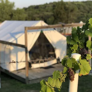 We visited in late July or early August. The grapes on the vines were beautiful! That's a tent in the background.